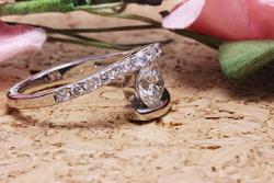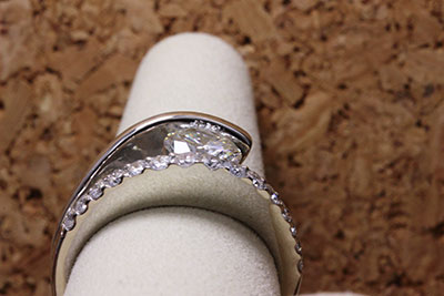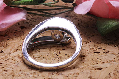 お客様がお持ちの指輪の中には、丸いメレダイヤと、角のダイヤが混在していました。角のダイヤを使うとイメージが異なってしますので、メインの1.2カラットのダイヤとラウンドのメレダイヤを使うことをご提案。