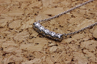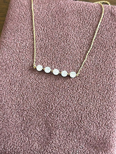 当時、ダイヤが5石の一文字タイプの指輪を、横一列に並んだラインネックレスにリフォームさせていただきました。