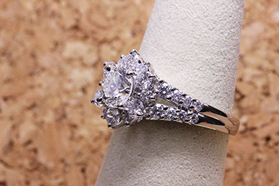 色々な経緯を経て、お選びいただいたのはメインのダイヤモンドを大きいメレダイヤで取り巻いた豪華デザイン。