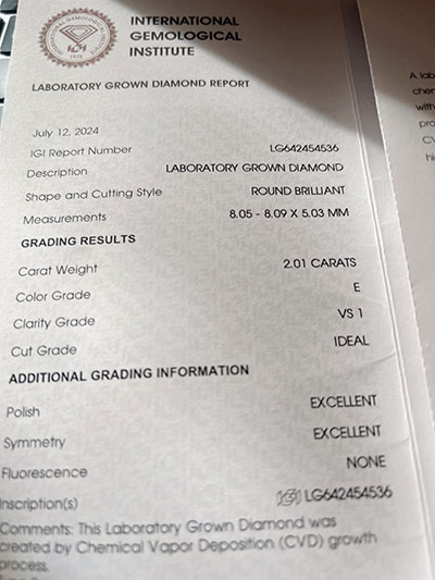 ラボグロウンダイヤの鑑定書の画像も合わせてお送りいただきました。