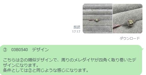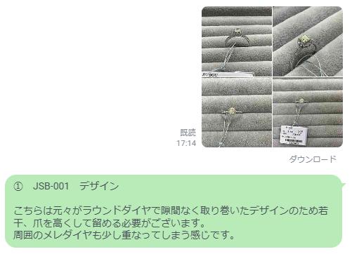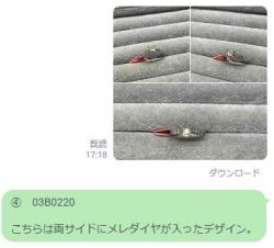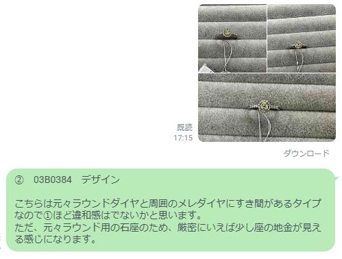 取り巻きタイプのデザイン、両サイドメレダイヤのデザインなど4パターンの写真をお送りし、お客様にお選びいただきました。