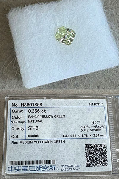 ダイヤのルースは「ファンシーイエローグリーン(Fancy Yellow Green)」という