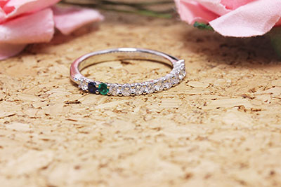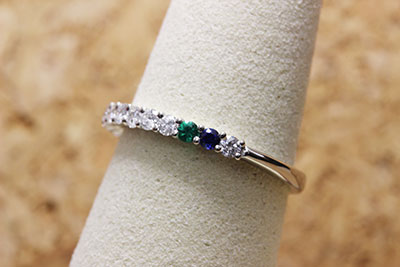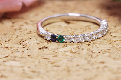 配列についはお客様のご希望をお聞きして、端から2pc・3pcのポジションにサファイアとエメラルドをセッティングすることに。
