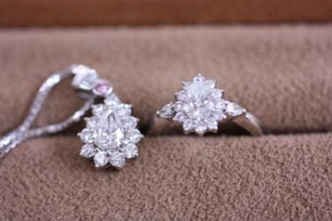 お持ちのペアシェープタイプの指輪とネックレス。