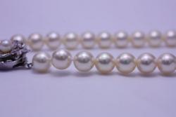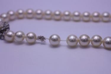 真珠の留め具を外して一直線にたらしてみると、珠の長さ以上に糸が長くなってないか確認することができます。