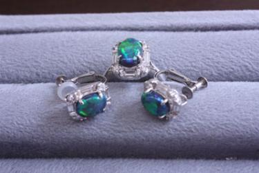 このブラックオパールの指輪とイヤリングのセット。