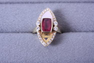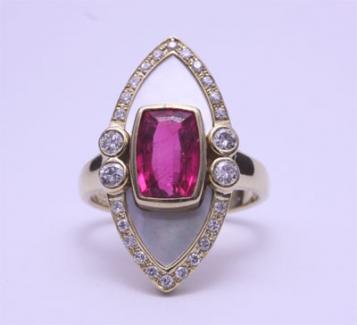 今回は18金ゴールドのデザインリングのアクセントとして貼り付けられていた白蝶貝の素材が落ちてしまったので直して欲しいとのご依頼でした。