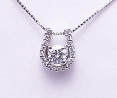馬蹄タイプのネックレスです。ダイヤの周囲にデザインを施すとダイヤが一回り大きく見える効果があるようです。