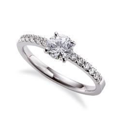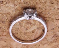 ダイヤを4本爪で留めたシンプルデザイン。両サイドに6pcづつのメレダイヤをあしらった定番デザインです。