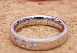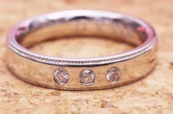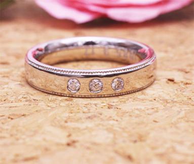 普段カジュアルに使えるようにと、指輪の両縁にはミル打ちという技法をこらした模様を、そしてダイヤモンドを3石セッティングさせていただきました。