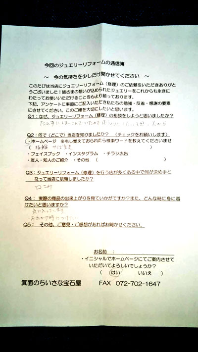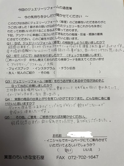 指輪の枠も高く買い取っていただきありがとうございました。他にもリフォームしたいものがありぜひお願いできればと思います。